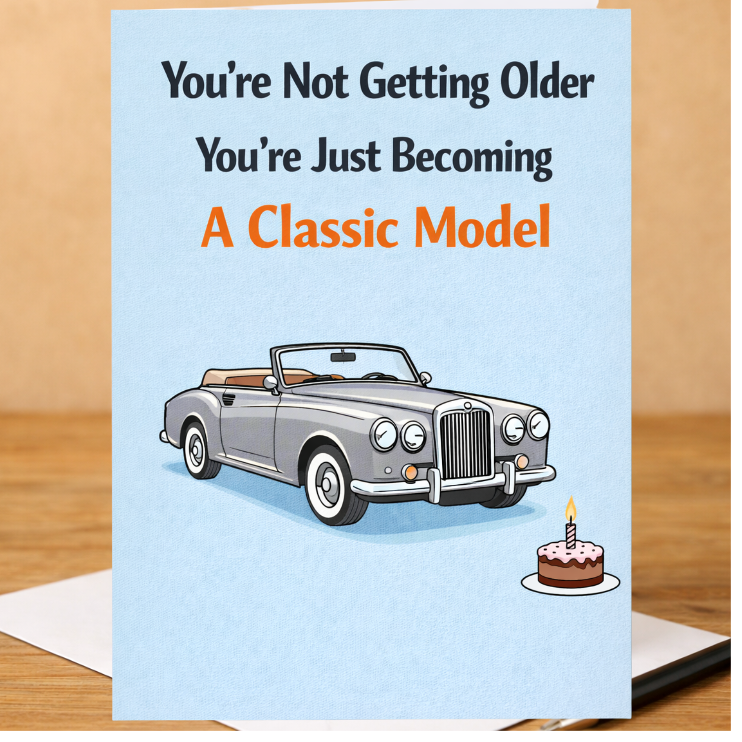 Celebrate another year with a card that gets it. This funny birthday card delivers the perfect roast with its cheeky message about becoming a classic model, rather than just getting older. It's ideal for friends who appreciate witty humour and don't mind a bit of playful teasing about age. The clever wordplay makes it memorable and laugh-out-loud worthy. Perfect for anyone who'd rather embrace the funny side of birthdays than dwell on the numbers. A card that says you know them well enough to make them smile.